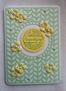 De basis is een rechthoekig kraftkaartje met daarop zwart papier (accentueert het geel zo mooi!). De achtergrond (honingraat) is zelfgemaakt. De bijtjes stonden in bestelling toen ik in de Action deze 2-in-1 embossingfolder met honinggraat tegenkwam! Hij embost natuurlijk, maar snijdt tevens ook uit.